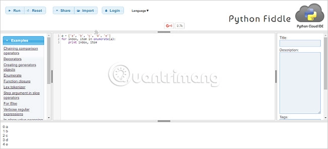 Python Fiddle là một trong những công cụ nên được giới thiệu cho bất cứ ai có kinh nghiệm về lập trình, nhưng không có kinh nghiệm trong Python. Giao diện khá đơn giản và dễ sử dụng, nhưng quan trọng hơn, nó đi kèm với một loạt code ví dụ mà bạn có thể load chỉ bằng một cú nhấp chuột.