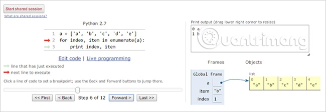 Python Tutor không phải là một shell Python tương tác. Thay vào đó, một khi bạn nhập code của mình, nó sẽ phân tích những gì bạn đã viết và trình bày trực quan về logic code. Kết quả sẽ là một loạt ảnh chụp nhanh mà bạn có thể xem qua, một dòng code tại một thời điểm, để xem code của bạn thực sự thực thi như thế nào từ đầu đến cuối.