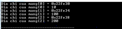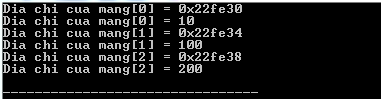 #include <iostream> using namespace std; const int MAX = 3; int main () { int mang[MAX] = {10, 100, 200}; int *contro; // bay gio chung ta co dia chi cua phan tu dau tien trong con tro. contro = mang; int i = 0; while ( contro <= &mang[MAX - 1] ) { cout << "Dia chi cua mang[" << i << "] = "; cout << contro << endl; cout << "Dia chi cua mang[" << i << "] = "; cout << *contro << endl; // tro toi vi tri o truoc contro++; i++; } return 0; }