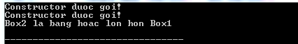 #include <iostream> using namespace std; class Box { public: // phan dinh nghia Constructor Box(double dai=1.0, double rong=1.0, double cao=1.0) { cout <<"Constructor duoc goi!" << endl; chieudai = dai; chieurong = rong; chieucao = cao; } double theTich() { return chieudai * chieurong * chieucao; } int sosanh(Box box) { return this->theTich() > box.theTich(); } private: double chieudai; // chieu dai cua mot box double chieurong; // chieu rong cua mot box double chieucao; // chieu cao cua mot box }; int main(void) { Box Box1(2.4, 4.2, 2.2); // khai bao box1 Box Box2(4.5, 2.0, 3.2); // khai bao box2 if(Box1.sosanh(Box2)) { cout << "Box2 la nho hon Box1" <<endl; } else { cout << "Box2 la bang hoac lon hon Box1" <<endl; } return 0; }