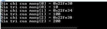 #include <iostream> using namespace std; const int MAX = 3; int main () { int mang[MAX] = {10, 100, 200}; for (int i = 0; i < MAX; i++) { *mang = i; // Day la cu phap chinh xac mang++; // cu phap nay la sai. Ban nen chu y. } return 0; }