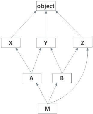 class X: passclass Y: passclass Z: passclass A(X,Y): passclass B(Y,Z): passclass M(B,A,Z): pass# Output:# [<class '__main__.M'>, <class '__main__.B'>,# <class '__main__.A'>, <class '__main__.X'>,# <class '__main__.Y'>, <class '__main__.Z'>,# <class 'object'>]
