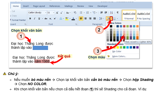 + Nếu muốn bỏ màu nền -> Chọn lại khối văn bản cần bỏ màu nền -> Chọn hộp Shading -> Chọn NO COLOR.