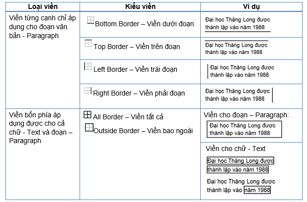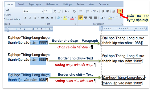 + Khi chọn khối văn bản nếu chọn cả dấu hết đoạn (¶) thì sẽ Border cho cả đoạn. Ví dụ: