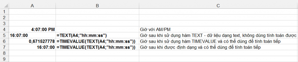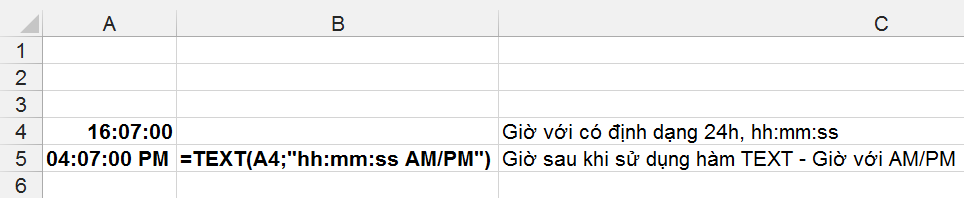 Muốn chuyển định dạng thời gian trong Excel từ 24h sang dạng AM/PM, chúng ta có thể áp dụng công thức text như sau: