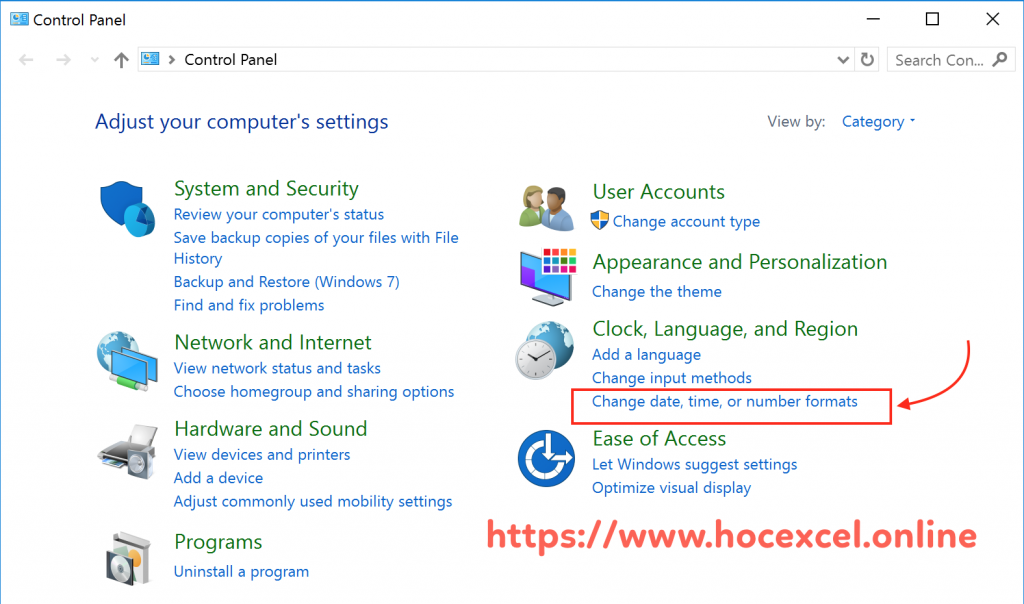 Bước 2: Trong cửa sổ Control Panel, chúng ta chọn mục Change date, time, or number formats