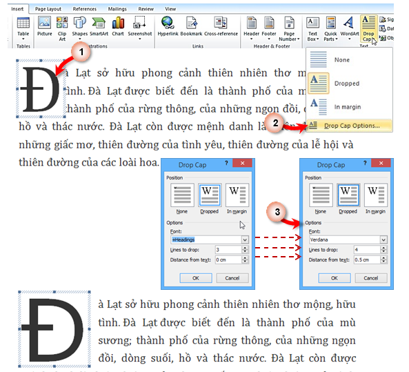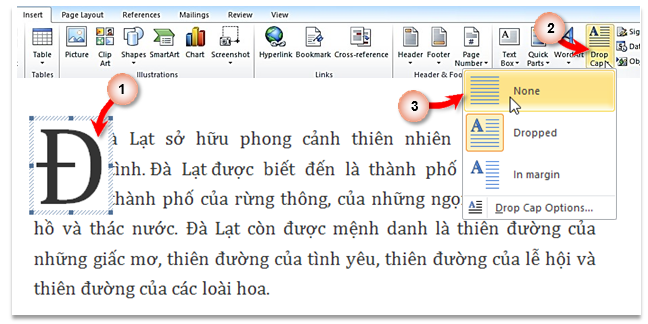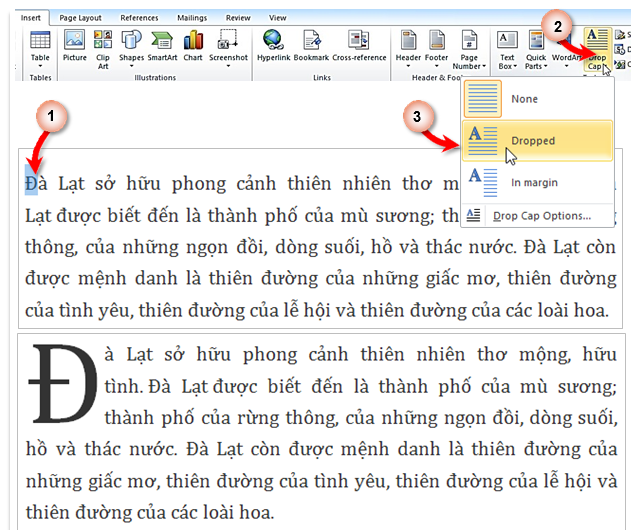 1. Insert DropCap – Tạo chữ to đầu đoạn văn bản