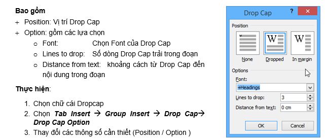 - Chọn Tab Insert à Group Insert à Drop Cap