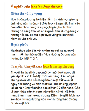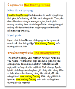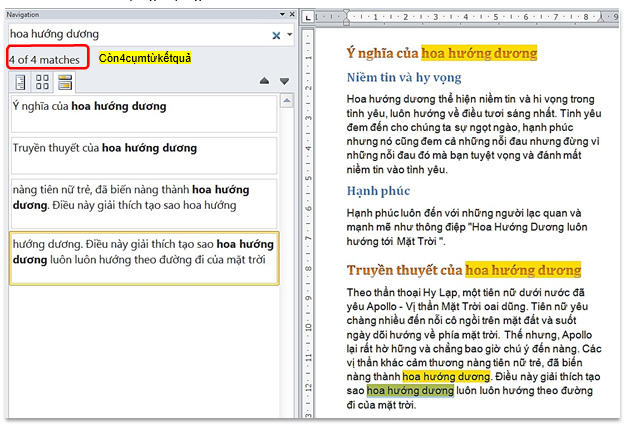 - Thay đổi lại bố cục tài liệu nhanh chóng. Chẳng hạn trong ví dụ trên, nếu bạn muốn chuyển mục “Truyền thuyết của hoa hướng dương” lên trước mục “Ý nghĩa của hoa hướng dương” thì trong Navigation Pane, bấm chọn mục “Truyền thuyết…” di và thả lên trước mục “Ý nghĩa…”