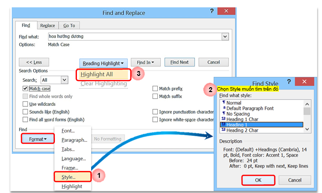 Chức năng này giúp người sử dụng có thể tìm kiếm style nào đó đã sử dụng trong văn bản.