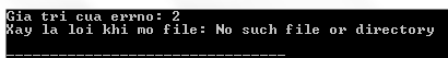 #include <stdio.h> #include <errno.h> #include <string.h> extern int errno ; int main () { FILE *fp; fp = fopen("fileexample.txt", "r"); if( fp == NULL ) { fprintf(stderr, "Gia tri cua errno: %d\n", errno); fprintf(stderr, "Xay la loi khi mo file: %s\n", strerror(errno)); } else { fclose(fp); } return(0); }