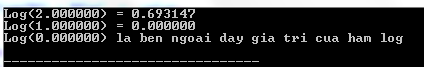 #include <stdio.h> #include <errno.h> #include <math.h> int main() { double x; double value; x = 2.000000; value = log(x); if( errno == ERANGE ) { printf("Log(%f) la ben ngoai day gia tri cua ham log\n", x); } else { printf("Log(%f) = %f\n", x, value); } x = 1.000000; value = log(x); if( errno == ERANGE ) { printf("Log(%f) la ben ngoai day gia tri cua ham log\n", x); } else { printf("Log(%f) = %f\n", x, value); } x = 0.000000; value = log(x); if( errno == ERANGE ) { printf("Log(%f) la ben ngoai day gia tri cua ham log\n", x); } else { printf("Log(%f) = %f\n", x, value); } return 0; }