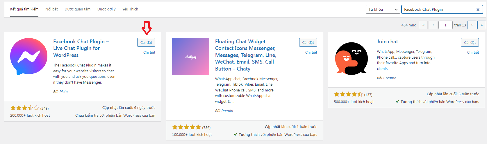 Bước 4. Sau khi xác định Plugin trò chuyện Facebook chính thức, bạn chỉ cần nhấp vào Cài đặt ngay. Sau khi cài đặt, kích hoạt plugin