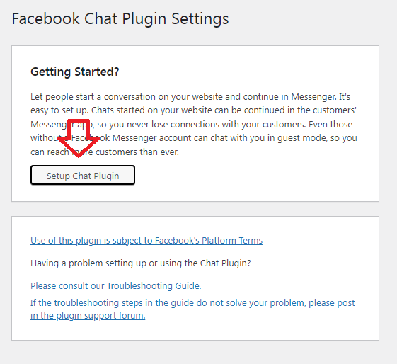 Bước 5. Sau khi cài đặt & Kích hoạt, di chuột đến menu “Cài đặt” => “Facebook Chat”. Tại cửa sổ cài đặt Plugin Facebook Chat, click vào nút “Setup Chat Plugin” để bắt đầu thiết lập plugin.