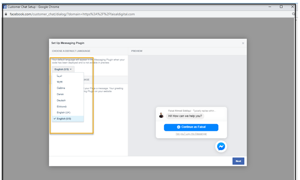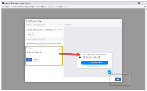 Bước 8. Bên dưới ngôn ngữ trò chuyện có một tùy chọn Lời chào. Thông điệp của lời chào có thể dễ dàng được sửa đổi nếu được yêu cầu. Chỉ cần nhấp vào Tiếp theo sau khi chọn ngôn ngữ và tin nhắn chào.