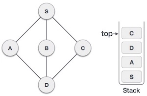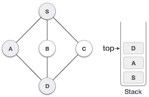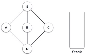 Đánh dấu đỉnh S là đã duyệt và đặt đỉnh này vào trong ngăn xếp. Tìm kiếm bất kỳ đỉnh liền kề nào mà chưa được duyệt từ đỉnh S. Chúng ta có 3 đỉnh và chúng ta có thể lấy bất kỳ đỉnh nào trong số chúng. Ví dụ, chúng ta lấy đỉnh A theo thứ tự chữ cái.