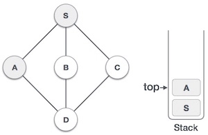 Đánh dấu đỉnh A là đã duyệt và đặt vào trong ngăn xếp. Tìm kiếm bất kỳ đỉnh liền kề nào với đỉnh A. Cả S và D đều là hai đỉnh liền kề A nhưng chúng ta chỉ quan tâm về đỉnh chưa được duyệt.