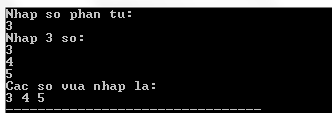 #include <stdio.h> #include <stdlib.h> int main() { int i, n; int *a; printf("Nhap so phan tu: \n"); scanf("%d",&n); a = (int*)calloc(n, sizeof(int)); printf("Nhap %d so: \n",n); for( i=0 ; i < n ; i++ ) { scanf("%d",&a[i]); } printf("Cac so vua nhap la: \n"); for( i=0 ; i < n ; i++ ) { printf("%d ",a[i]); } return(0); }