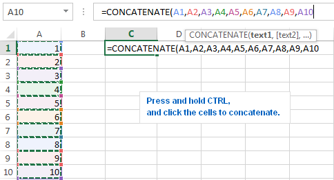 Chú ý. Khi sử dụng phương pháp này bạn phải nhấp vào từng ô riêng lẻ. Việc chọn một dải bằng chuột sẽ thêm một mảng vào công thức, và hàm CONCATENATE không chấp nhận.