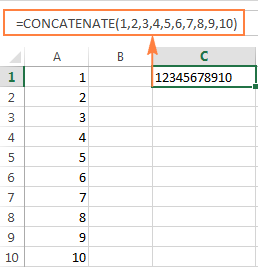 Chú ý. Cho dù bạn sử dụng phương pháp nào, giá trị nối trong C1 là một chuỗi văn bản (chú ý dữ liệu được canh lề trái trong ô), mặc dù mỗi giá trị ban đầu là một số. Điều này là do hàm CONCATENATE luôn trả về một chuỗi văn bản bất kể loại dữ liệu nguồn.
