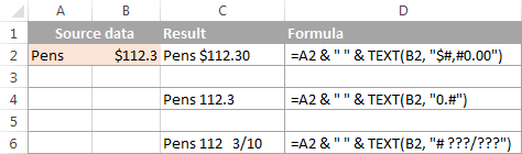 =A2 & ” ” & TEXT(B2, “0.#”) – không hiển thị số không trước dấu phảy và dấu $.
