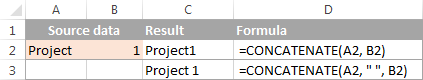 Một khoảng trống (“”) được thêm vào giữa các giá trị kết hợp, để kết quả hiển thị như là “Project1 ” chứ không phải là “Project1 “.