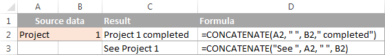 =CONCATENATE(A1, ” “, B1, ” completed”)