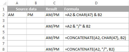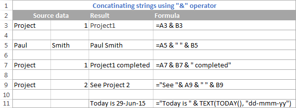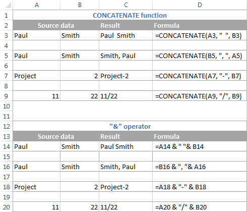 Để xem toán tử nối đang hoạt động, hãy viết lại các công thức CONCATENATE đã thảo luận ở trên: