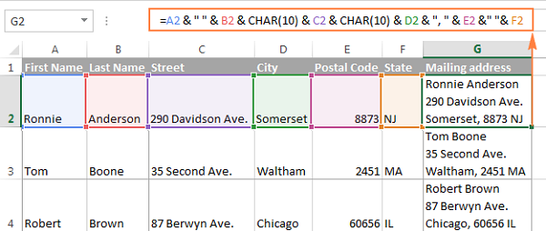 =A2 & ” ” & B2 & CHAR(10) & C2 & CHAR(10) & D2 & “, ” & E2 & ” ” & F2