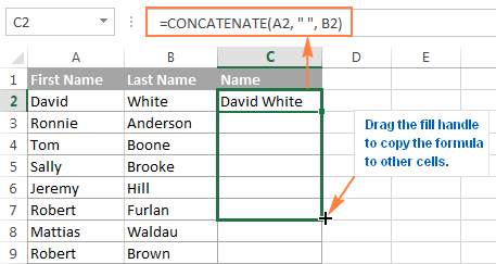 Ví dụ, để nối hai cột (cột A và B) tách các giá trị với khoảng trắng, bạn nhập công thức sau vào ô C2, và sau đó sao chép nó xuống các ô khác. Khi bạn kéo xuống để sao chép công thức, con trỏ chuột sẽ thay đổi thành hình chữ thập, như thể hiện trong hình bên dưới: