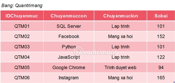 Ở ví dụ này ta đếm số lượng chuyên mục có trong bảng Quantrimang mà số bài lớn hơn 100.