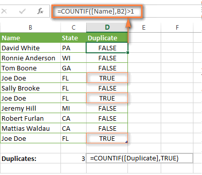 Ví dụ, công thức đơn giản này = COUNTIF (B2: B10, B2)> 1 sẽ tìm các giá trị trùng lặp với ô B2, trả kết quả TRUE/FALSE về cột Duplicate trong khoảng B2: B10 trong khi một hàm khác = COUNTIF (D2: D10, TRUE) sẽ cho bạn biết có bao nhiêu lần trùng lặp: