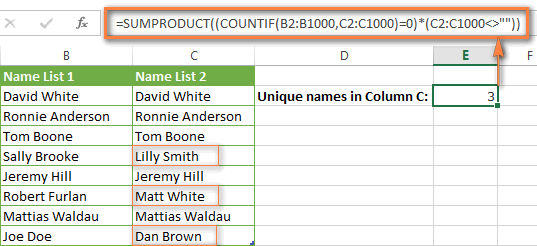 = SUMPRODUCT ((COUNTIF (B2: B1000, C2: C1000) = 0) * (C2: C1000 <> “”))