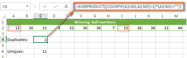 = SUMPRODUCT ((COUNTIF (A2: I2, A2: I2)> 1) * (A2: I2 <> “”))