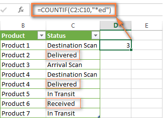 = COUNTIF (C2: C10, “* ed”) – tính các ô kết thúc bằng chữ “ed”.
