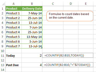 | Đếm ngày trong một khoảng thời gian | =COUNTIF(B2:B10, “>=6/7/2014”)-COUNTIF(B2:B10, “>6/1/2014”) |