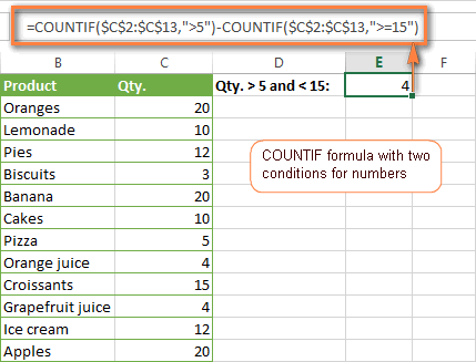 = COUNTIF (B2: B13, “Lemonade”) + COUNTIF (B2: B13, “* juice”) + COUNTIF (B2: B13, “Ice cream”)