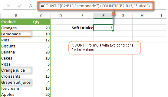 = COUNTIF (B2: B13, “Lemonade”) + COUNTIF (B2: B13, “* juice”)