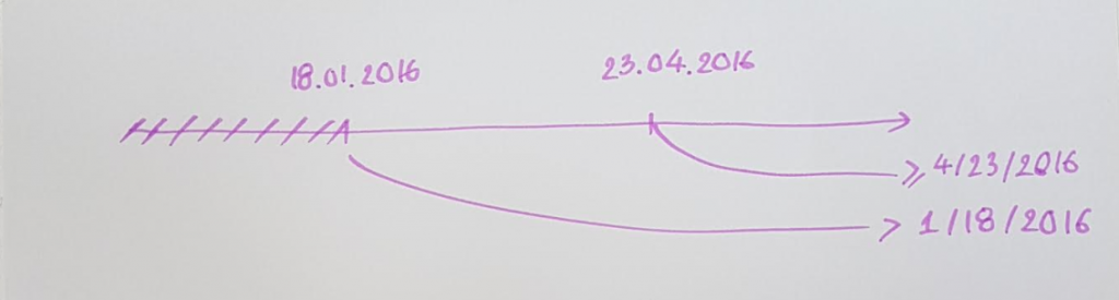 =COUNTIF(A1:A100,”>1/18/2016″) – COUNTIF(A1:A100,”>=4/23/2016″)