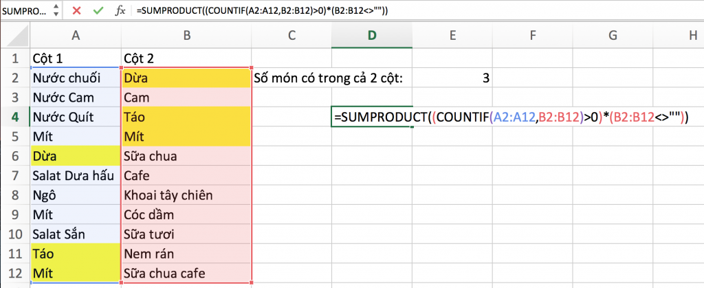 Nếu bạn có hai danh sách riêng biệt, ví dụ danh sách tên trong các cột B và C, và bạn muốn biết có bao nhiêu tên xuất hiện trong cả hai cột, bạn có thể sử dụng hàm COUNTIF kết hợp với chức năng SUMPRODUCT để đếm số lần lặp: