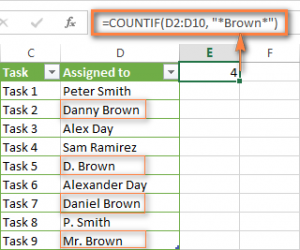 Giả sử bạn có một danh sách các nhiệm vụ được giao cho những người khác nhau và bạn muốn biết số nhiệm vụ được giao cho Danny Brown. Bởi vì tên của Danny được viết bằng nhiều cách khác nhau, ta nhập “* Brown *” là điều kiện = COUNTIF (D2: D10, “*Brown *”).