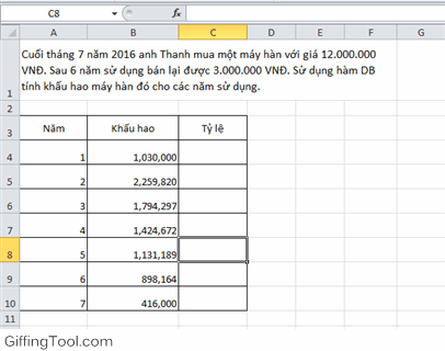 Ví dụ: Cuối tháng 7 năm 2016 anh Thanh mua một máy hàn với giá 12.000.000 VNĐ. Sau 6 năm sử dụng bán lại được 3.000.000 VNĐ. Sử dụng hàm DB tính khấu hao máy hàn đó cho các năm sử dụng.