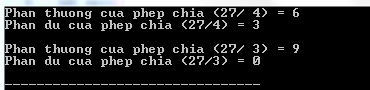 #include <stdio.h> #include <stdlib.h> int main() { div_t output; output = div(27, 4); printf("Phan thuong cua phep chia (27/ 4) = %d\n", output.quot); printf("Phan du cua phep chia (27/4) = %d\n", output.rem); output = div(27, 3); printf("\nPhan thuong cua phep chia (27/ 3) = %d\n", output.quot); printf("Phan du cua phep chia (27/3) = %d\n", output.rem); return(0); }