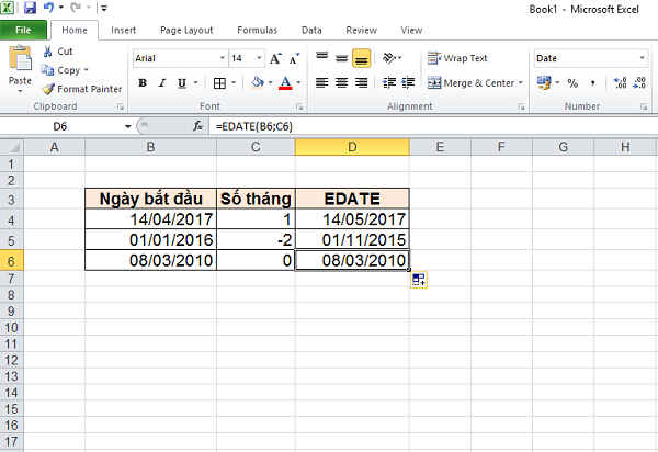 - Dùng công thức: =EDATE(B4;C4), thu được đáp án.
