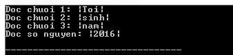 #include <stdio.h> #include <stdlib.h> int main() { char str1[10], str2[10], str3[10]; int year; FILE * fp; fp = fopen ("baitapc.txt", "w+"); fputs("Toi sinh nam 2016", fp); rewind(fp); fscanf(fp, "%s %s %s %d", str1, str2, str3, &year); printf("Doc chuoi 1: |%s|\n", str1 ); printf("Doc chuoi 2: |%s|\n", str2 ); printf("Doc chuoi 3: |%s|\n", str3 ); printf("Doc so nguyen: |%d|\n", year ); fclose(fp); return(0); }