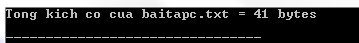 #include <stdio.h> int main () { FILE *fp; int len; fp = fopen("baitapc.txt", "r"); if( fp == NULL ) { perror ("Xay ra loi khi mo file!!!"); return(-1); } fseek(fp, 0, SEEK_END); len = ftell(fp); fclose(fp); printf("Tong kich co cua baitapc.txt = %d bytes\n", len); return(0); }