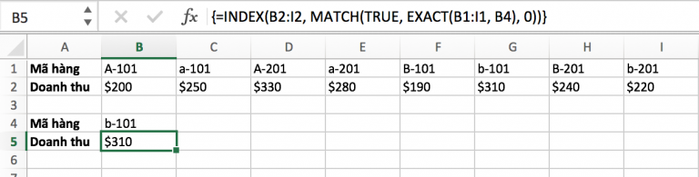 INDEX (hàng chứa giá trị trả về, MATCH (TRUE, EXACT (hàng tìm kiếm, giá trị tìm kiếm), 0))