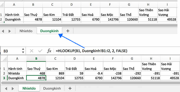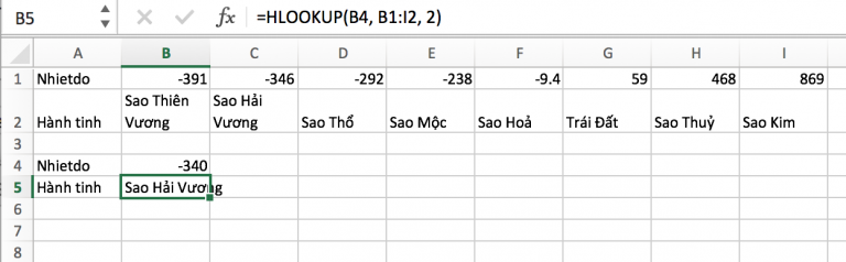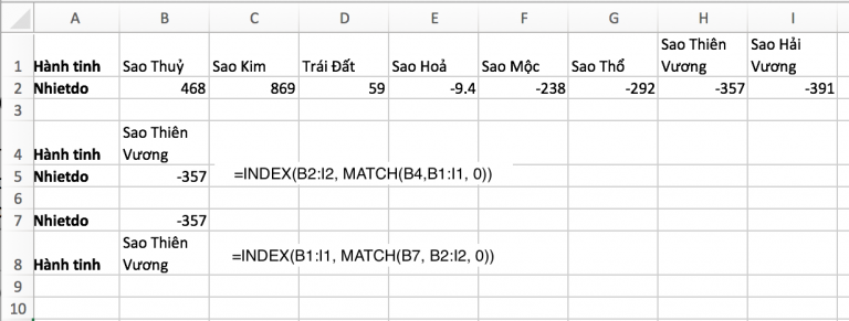 Giả sử bạn có một danh sách các hành tinh ở hàng 2 (B2:I2) và nhiệt độ của chúng ở hàng 1 (B1:I1). Bạn muốn tìm hành tinh có nhiệt độ bằng nhiệt độ ở ô B4.