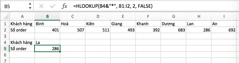 Ví dụ, bạn có một danh sách tên các khách hàng ở hàng 1 và số order ở hàng 2. Bạn muốn tìm số order của một khách hàng nhất định nào đó nhưng bạn không thể nhớ tên chính xác vị khách mà chỉ nhớ nó bắt đầu với chữ “La”.