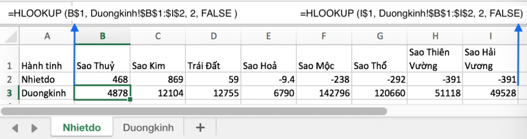 Trong công thức trên, chúng ta sử dụng tham chiếu tuyệt đối ($B$1:$I$2) trong table_array vì nó cần được giữ không đổi khi công thức được sao chép từ các ô khác